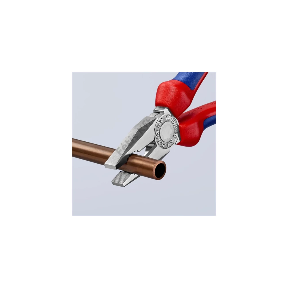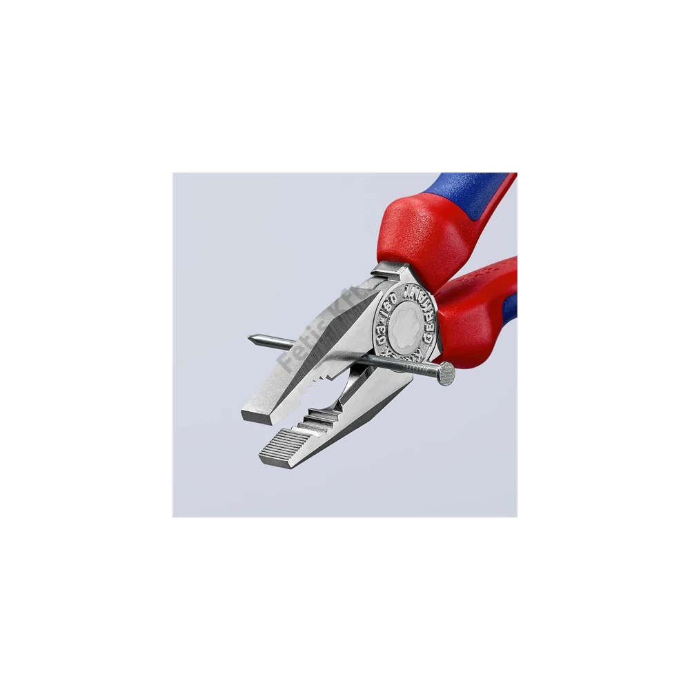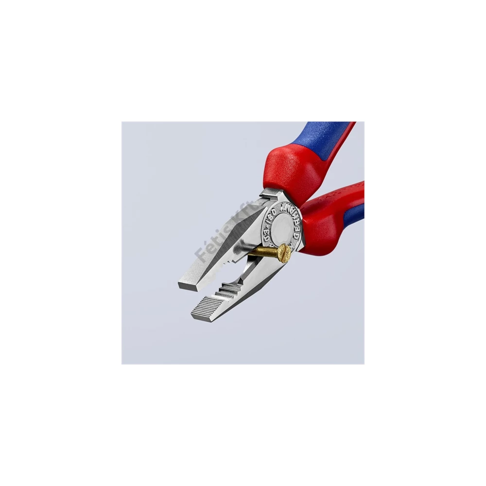 Kombinált fogó Markoló zónákkal a lapos és kerek anyagokhoz, sokoldalú használatra. Vágóélekkel puha és kemény huzalhoz. Hosszú vágóélek vastagabb kábelekhez. Vágóélek plusz induktív edzéssel, vágóél keménység kb. 60 HRC.